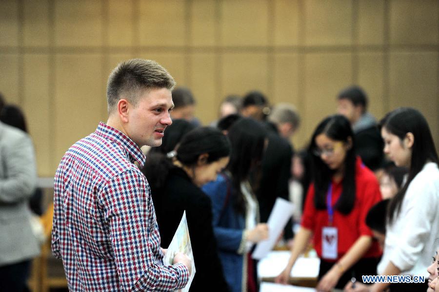 | Foreign graduates talk with recruiters at a job fair especially held for foreign students in Heilongjiang University in Harbin, capital of northeast China's Heilongjiang Province, April 25, 2015. More than 200 foreign graduates from ten countries tried to find a job at the fair. (Xinhua/Wang Song) |