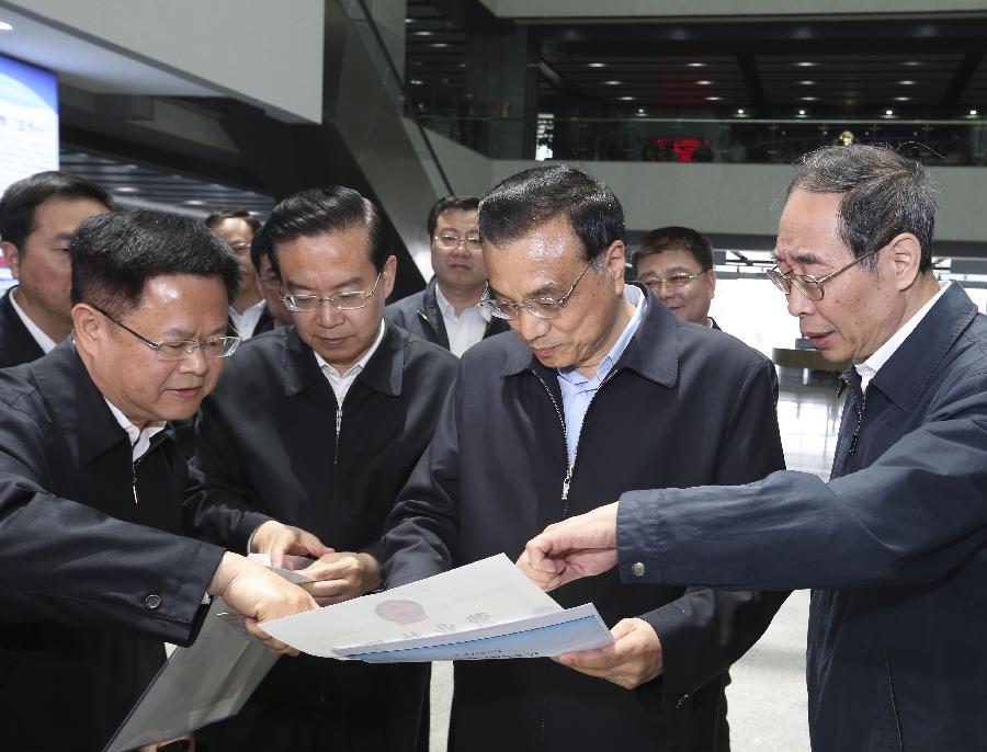 Chinese Premier Li Keqiang (2nd R, front) inspects Xiamen Area of China (Fujian) Pilot Free Trade Zone in Xiamen, southeast China's Fujian Province, April 22, 2015. Li visited cities of Xiamen, Quanzhou and Fuzhou of Fujian province from April 22 to 24. (Xinhua/Ding Lin)