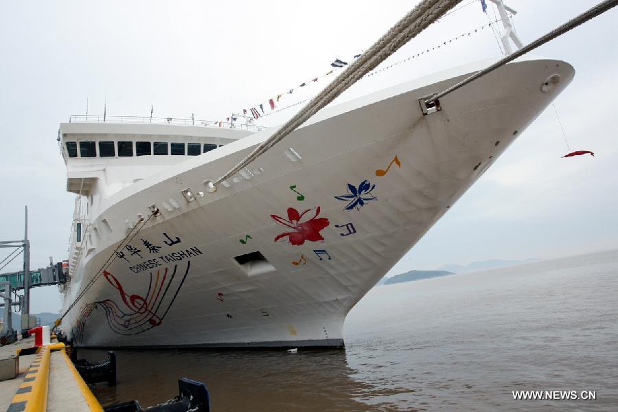 Passenger liner Chinese Taishan docks at a port in Zhoushan, east China's Zhejiang Province, April 24, 2015. A new route linking Zhoushan and southeast China's Taiwan was officially launched on Friday, as nearly 900 passengers started their journey to Taiwan from Zhoushan by the passenger liner named as Chinese Taishan. (Xinhua/Shen Jizhong)