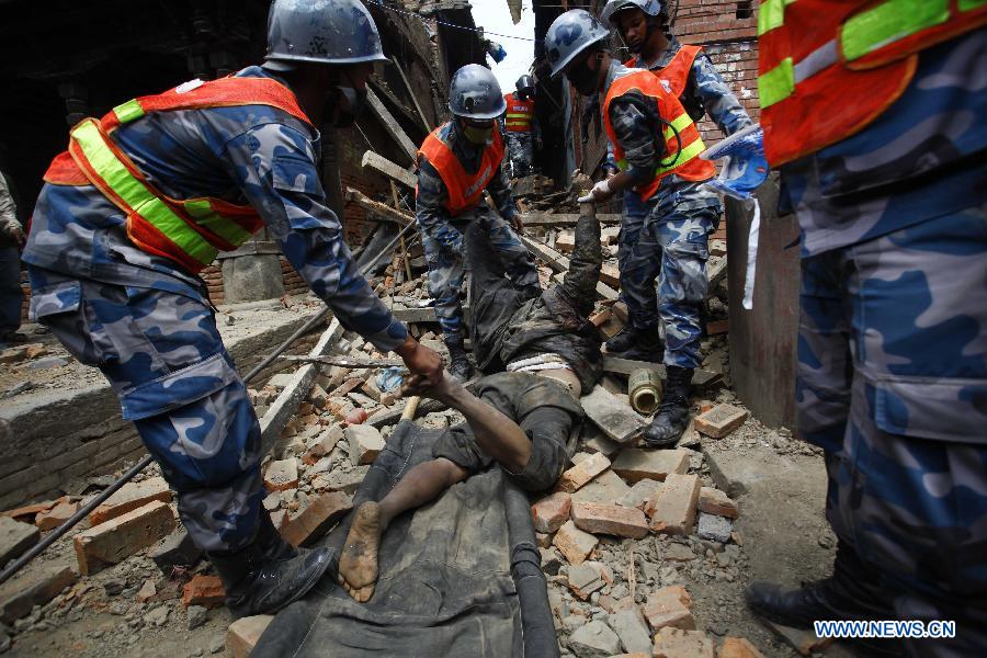 Members of the Nepalese Armed Police Force carry the body of a victim from a house in Bhaktapur, Nepal, April 26, 2015. A total of 3,218 people were killed and about 6,500 others injured in the powerful earthquake that struck Nepal on Saturday, the authorities said April 27. (Xinhua/Pratap Thapa)