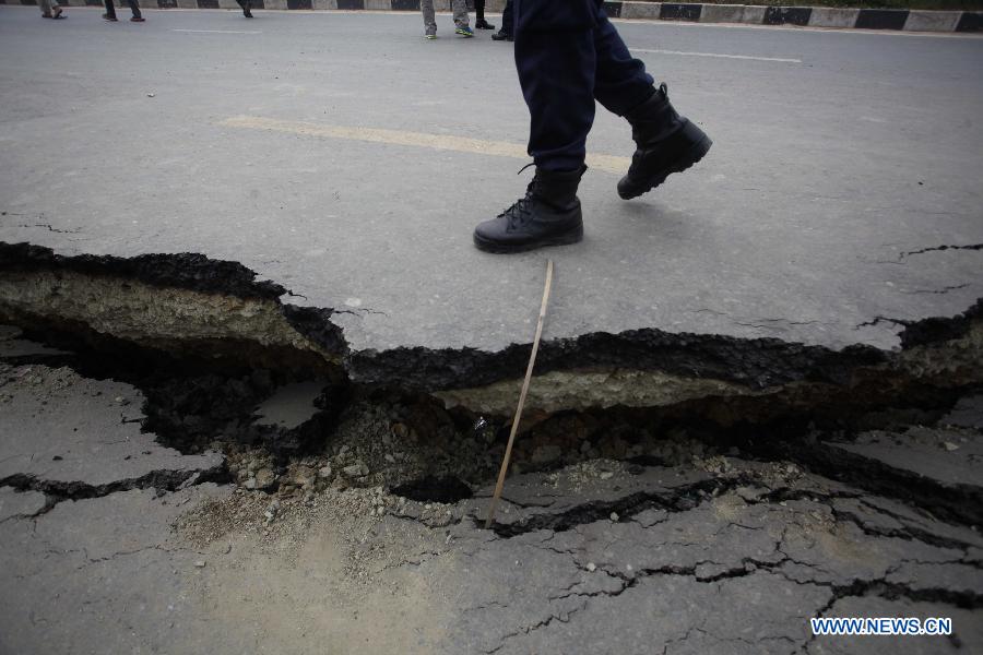 A man walks on a damaged road in Bhaktapur, Nepal, April 26, 2015. A total of 3,218 people were killed and about 6,500 others injured in the powerful earthquake that struck Nepal on Saturday, the authorities said April 27. (Xinhua/Pratap Thapa)