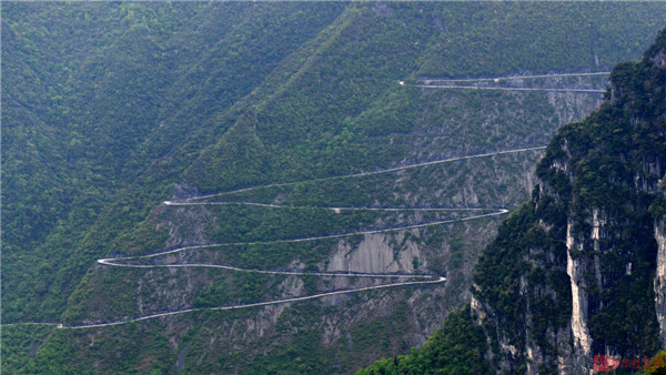 In the mountains of west Hubei province, there is a steep mountain road dug up by the locals. People call the road a “sky road” as it hangs above the mountain if they look at it from afar. (Xinhua/Song Wen)