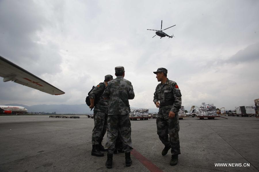 Members of Chinese People's Liberation Army Air Force arrive in Nepal to provide aid following Saturday's earthquake at Tribhuvan International Airport in Kathmandu, Nepal, April 28, 2015. (Xinhua/Pratap Thapa)