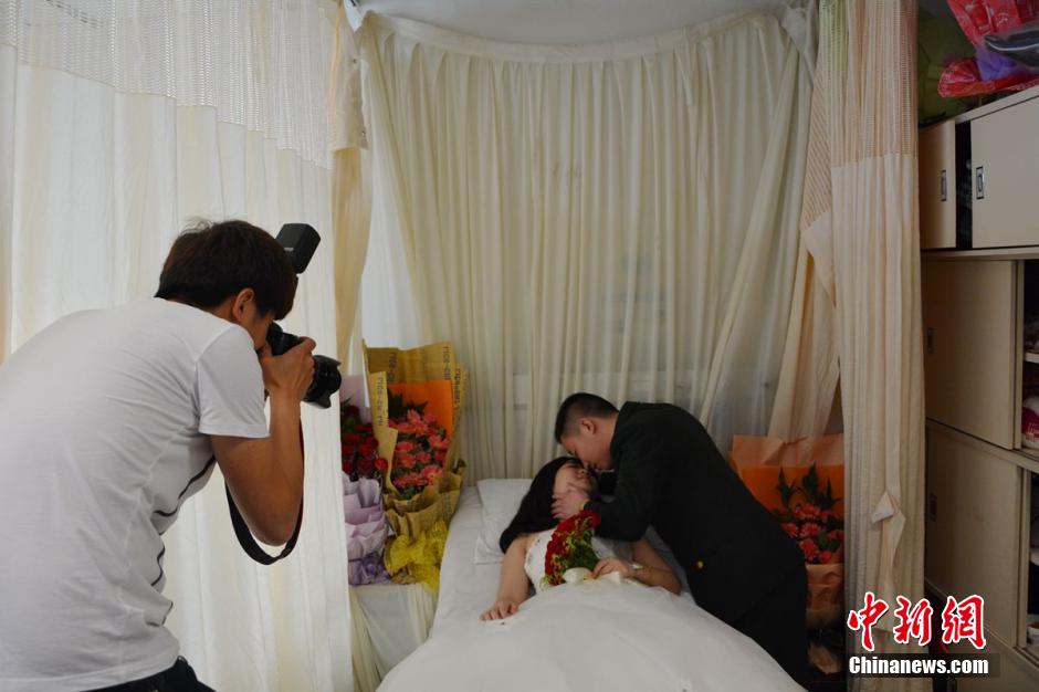 Guo Kai and Dong Hui take wedding dress photos in the ward, April 26, 2015. (Chinanews/Hu Min)