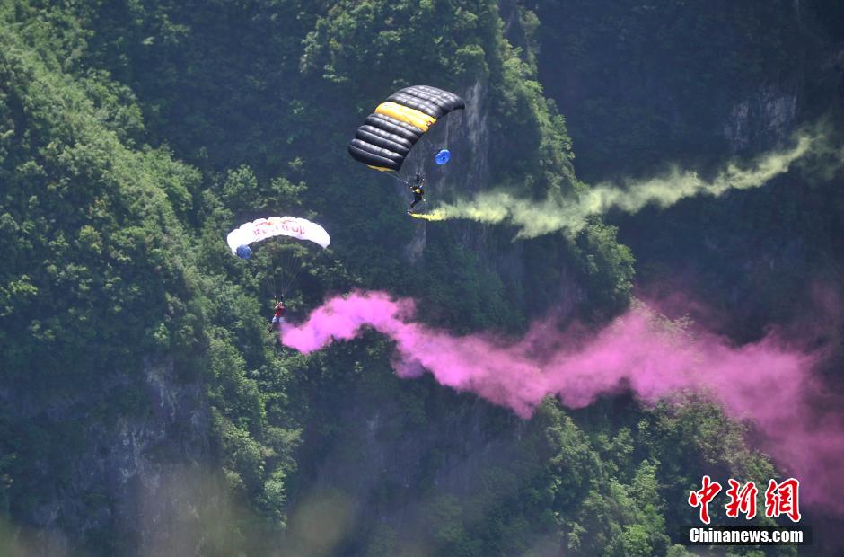 On April 26, 2015, the world's top wingsuit enthusiast Miles and China's No.1 wingsuit enthusiast Xu Kai perform low-altitude parachuting at the world's longest cantilever bridge in the Longgang Scenic Zone of Yunyang county, southwest China’s Chongqing. The bridge was officially opened to the public on the day. (CNS Photo)