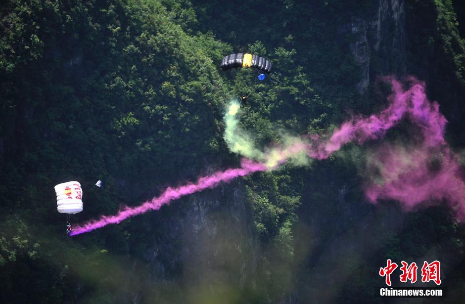 On April 26, 2015, the world's top wingsuit enthusiast Miles and China's No.1 wingsuit enthusiast Xu Kai perform low-altitude parachuting at the world's longest cantilever bridge in the Longgang Scenic Zone of Yunyang county, southwest China’s Chongqing. The bridge was officially opened to the public on the day. (CNS Photo)