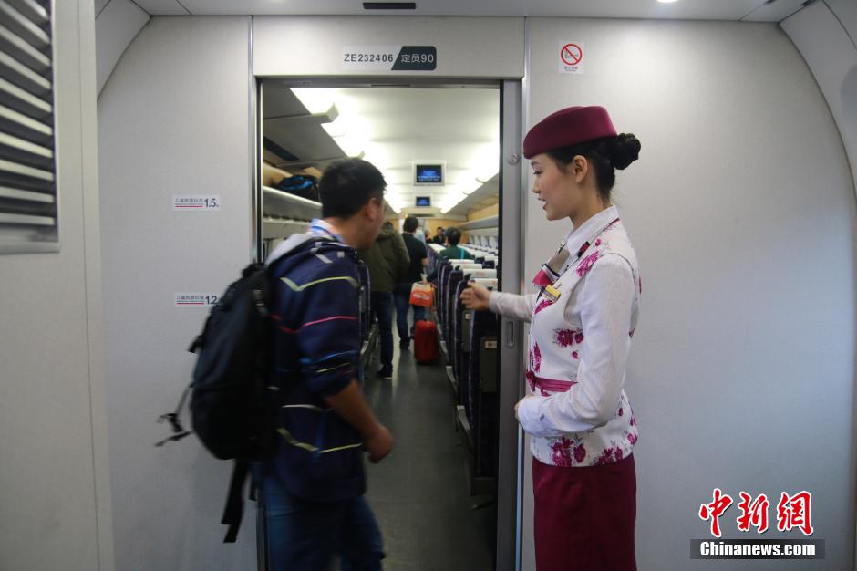 A stewardess welcomes the guest.(Photo/Chinanews.com)