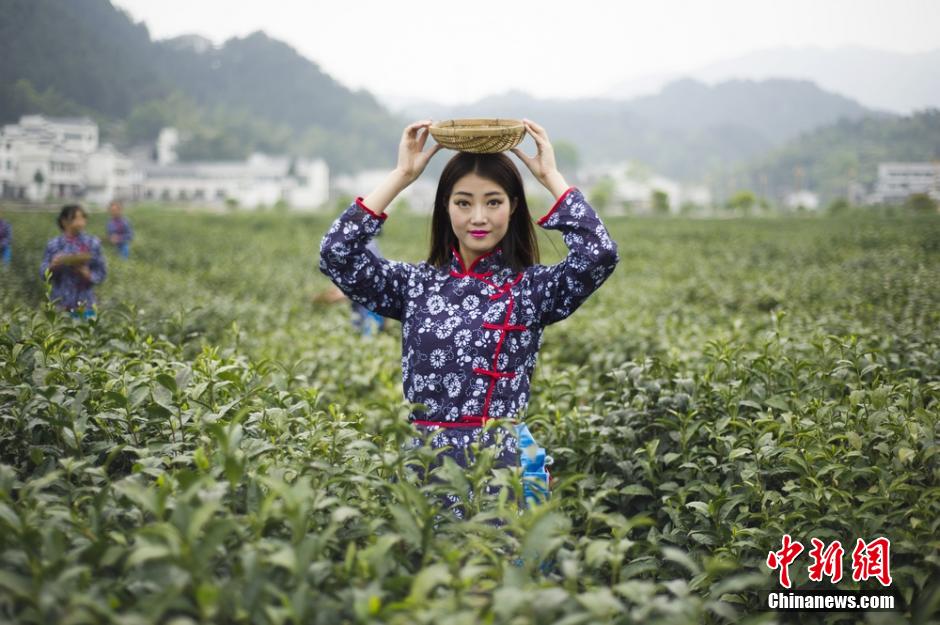 Models dressed in cheongsams pick the tea leaves in a tea plantation in Mount Wei, central China's Hunan province on the Monday. (Chinanews.com/Yang Huafeng)