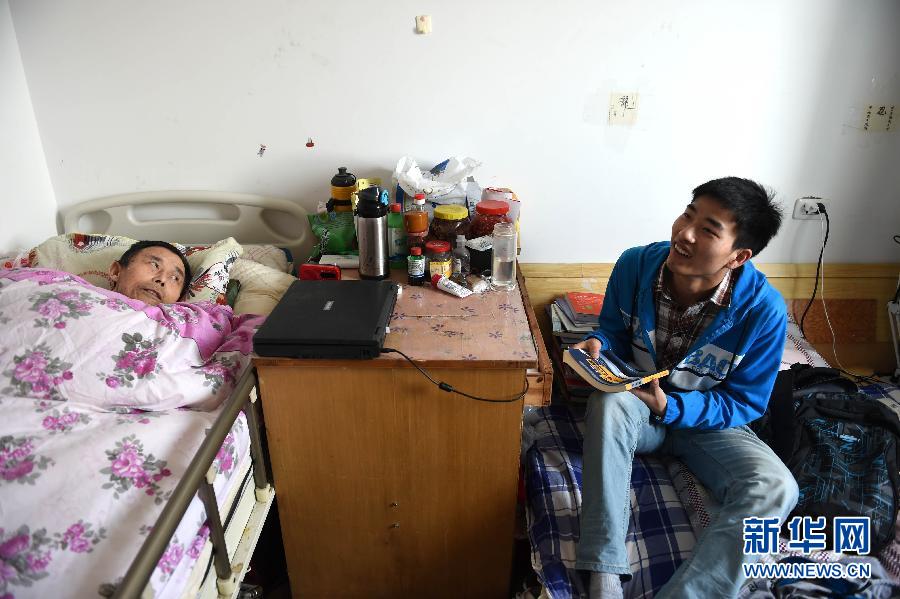 Guo Shijun (R) chats with his father on April 8, 2015. (Xinhua/Liu Junxi)