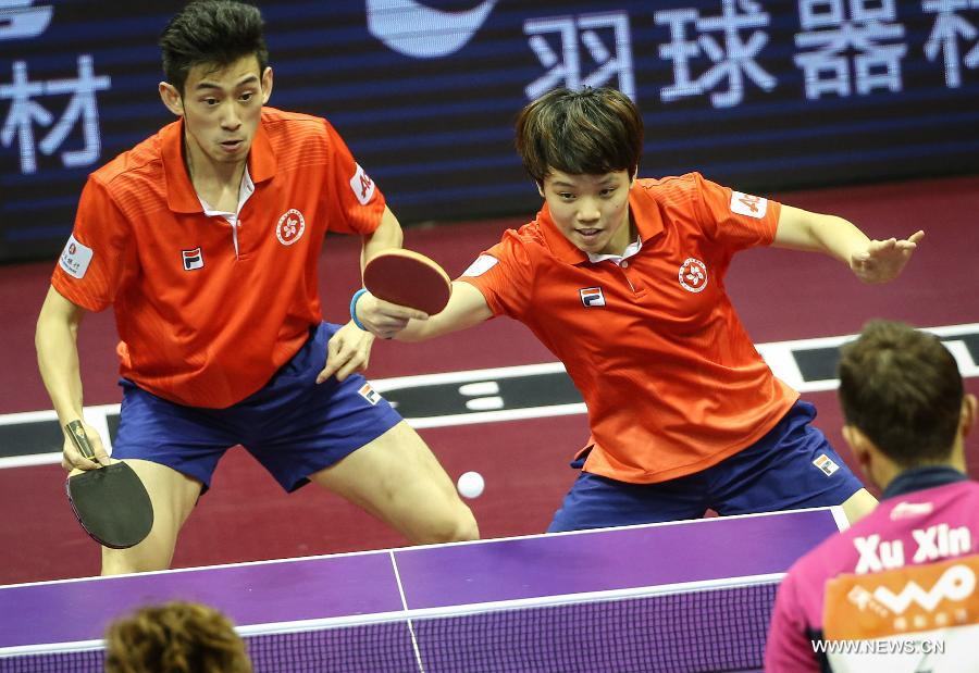 Hong Kong China's Wong Chun Ting(Top, L)/Doo Hoi Kem(Top, R) compete during the Mixed Doubles match against China's Xu Xin/South Korea's Yang Haeun at the 53rd Table Tennis World Championships in Suzhou, city of east China's Jiangsu Province, on April 30, 2015. Xu Xin/Yang Haeun won the match 4-1. (Xinhua/Yang Lei)