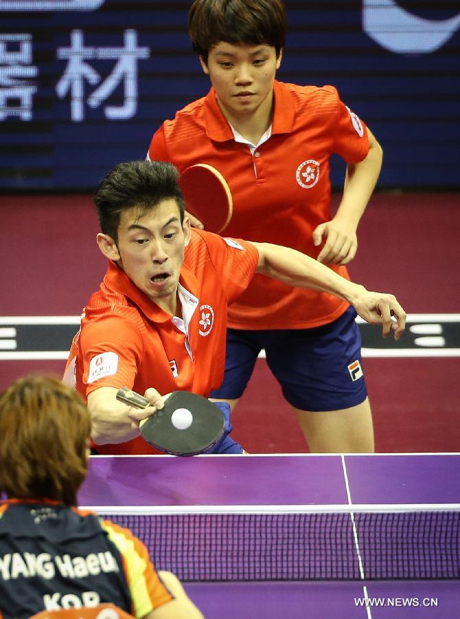 Hong Kong China's Wong Chun Ting(Top, L)/Doo Hoi Kem(Top, R) compete during the Mixed Doubles match against China's Xu Xin/South Korea's Yang Haeun at the 53rd Table Tennis World Championships in Suzhou, city of east China's Jiangsu Province, on April 30, 2015. Xu Xin/Yang Haeun won the match 4-1. (Xinhua/Yang Lei)