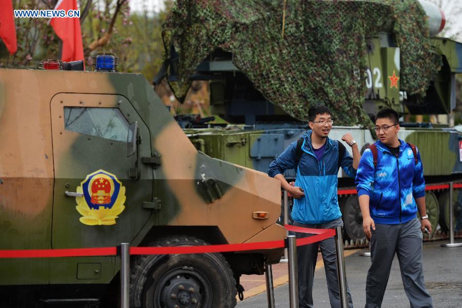 People view the displayed weapons during the 2015 northwest defense and weapon industry exhibition in Lanzhou, capital of northwest China's Gansu Province, April 30, 2015. The exhibition will last until May 17. (Xinhua/Chen Bin)