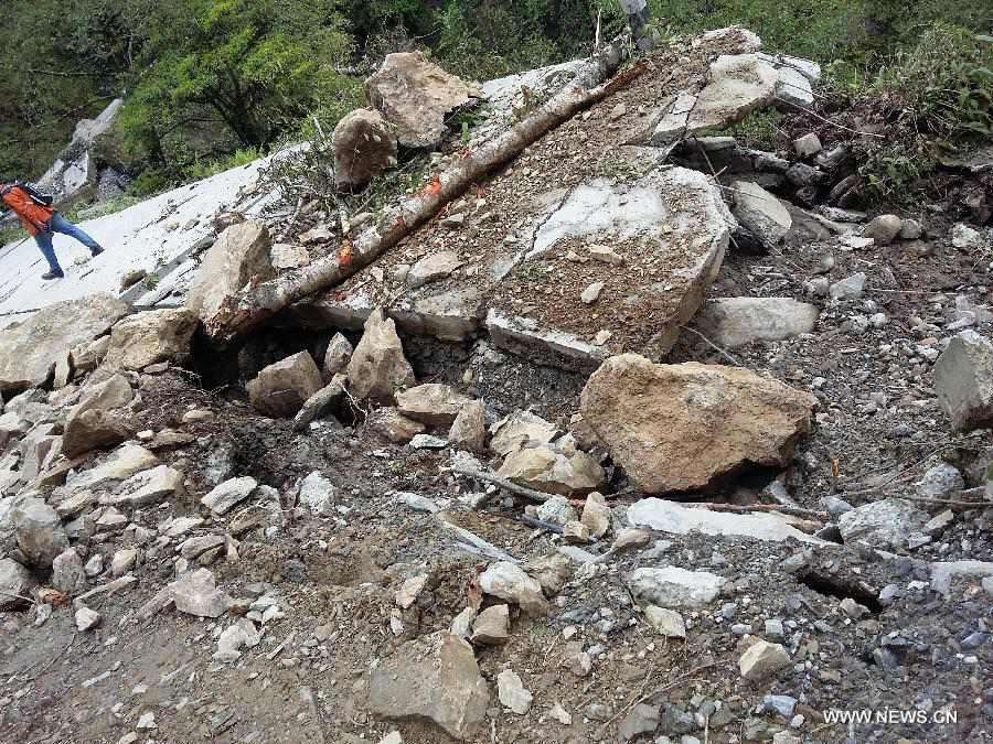 Photo taken on May 1, 2015 shows a damaged road in Rasuwa, Nepal. (Xinhua/Sunil Sharma)