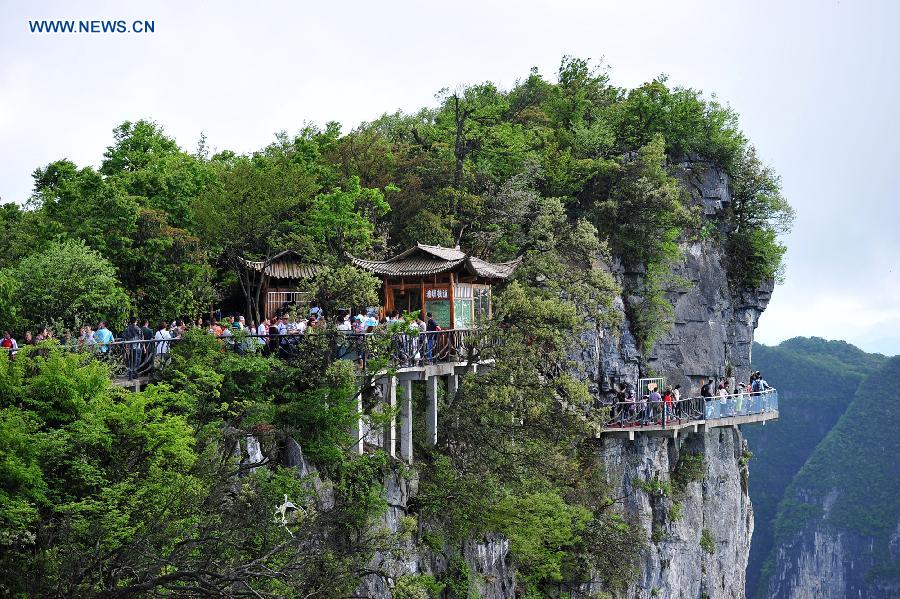 Tourists walk on a pavement built with glass on the cliff at the national forest park in Tianmen Mountain in Zhangjiajie, central China's Hunan Province, May 2, 2015. Many tourists come to experience the glass pavement built on the cliff of Tianmen Mountain with an altitude of about 1,430 meters during the May Day holiday. (Xinhua/Shao Ying)