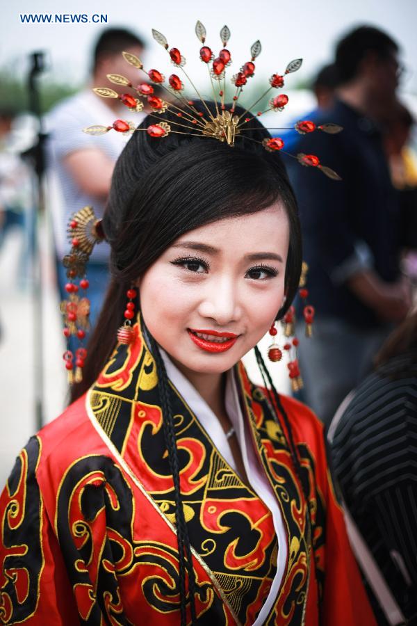 A model displays the Hanfu, or Han dress, in Mang Dang Mountain Han Culture Tourism Area in Yongcheng City of central China's Henan Province, May 2, 2015. Hanfu is the traditional dress of the Han Chinese people. (Xinhua/Zheng Huansong)