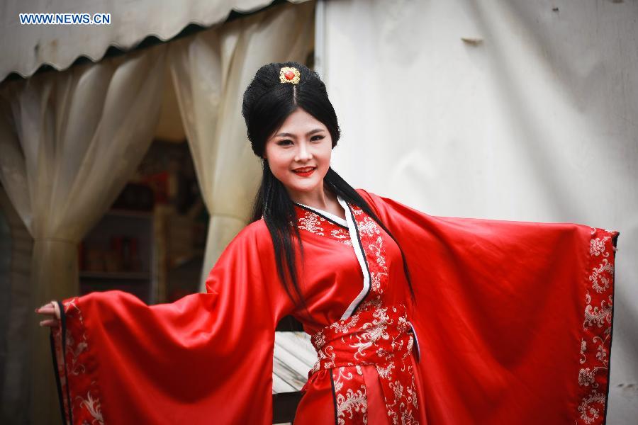 A model displays the Hanfu, or Han dress, in Mang Dang Mountain Han Culture Tourism Area in Yongcheng City of central China's Henan Province, May 2, 2015. Hanfu is the traditional dress of the Han Chinese people. (Xinhua/Zheng Huansong)