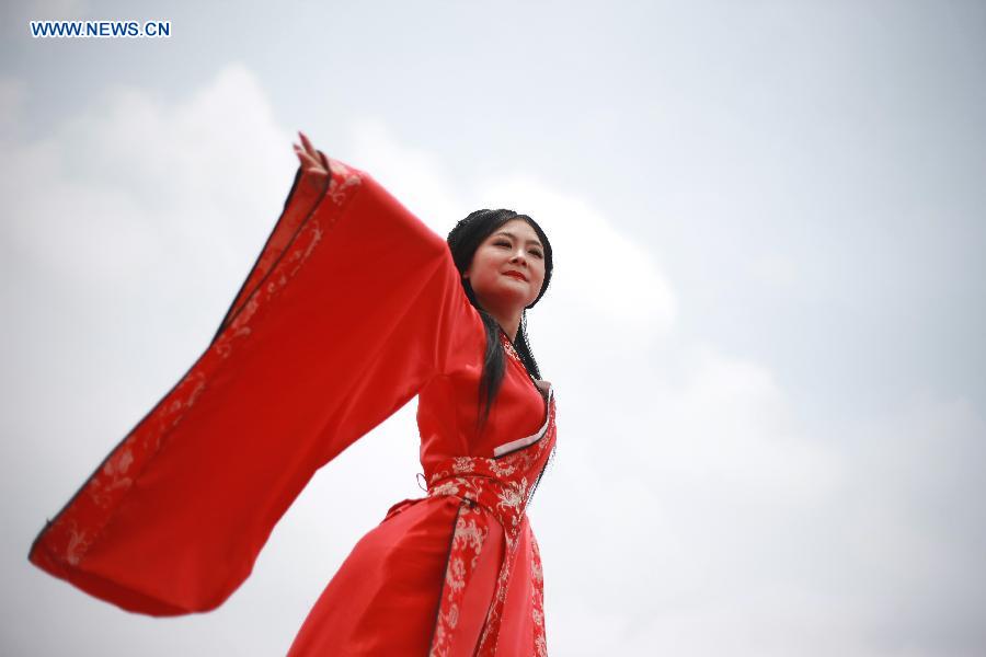 A model displays the Hanfu, or Han dress, in Mang Dang Mountain Han Culture Tourism Area in Yongcheng City of central China's Henan Province, May 2, 2015. Hanfu is the traditional dress of the Han Chinese people. (Xinhua/Zheng Huansong)