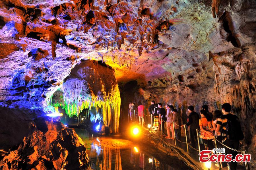 | Tourists visit underground karst caves at a scenic spot in southwest China's Chongqing municipality, May 4, 2015. The underground caves and rivers attracted many tourists during the 3-day May Day holiday. (Photo: China News Service/Zhong Xin) |