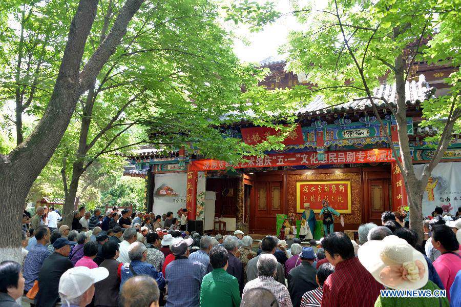 Tourists watch Lyuju Opera performance at the Baotuquan Park in Jinan, capital of east China's Shandong Province, on May 1, 2015. Shandong received more than 28 million tourists during the May Day holidays on May 1-3. (Xinhua/Zhu Zheng)