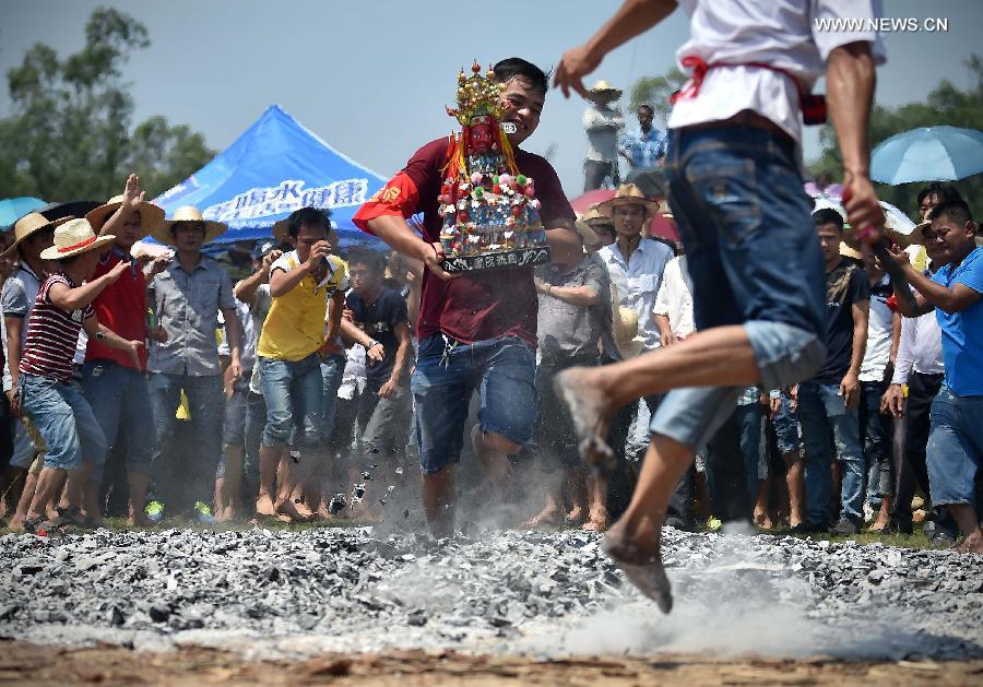Local residents participate in folklore performance in Ding'an County of south China's Hainan Province, May 3, 2015. A series of local folklore activities called Naojunpo in Chinese is held in Ding'an Sunday. This folk custom of Hainan, which is in commemoration of an ancient heroine, is said to have a history of over 1300 years. (Xinhua/Guo Cheng)