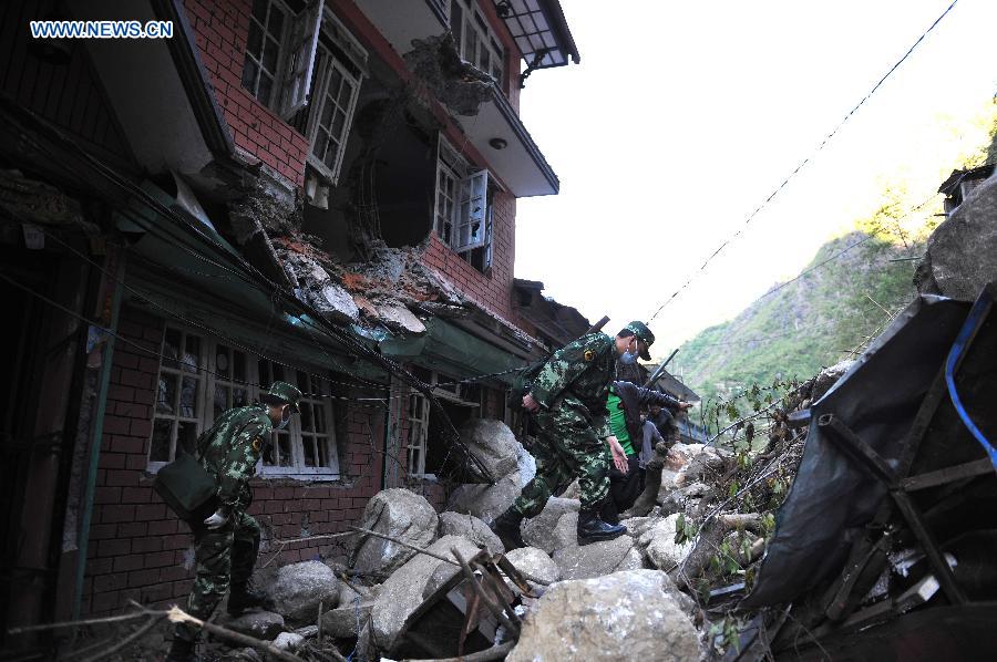 Soldiers of the traffic rescue brigade of China's Armed Police Force pass by a damaged building in Sindhupalchowk, Nepal, on May 4, 2015. China's armed police officers of traffic rescue left southwestern Tibet Autonomous Region and entered Nepal for the first time on Sunday to aid earthquake relief there. (Xinhua/Wen Tao)