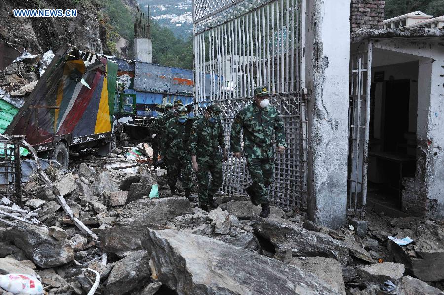General Fu Ling (R) and soldiers of the traffic rescue brigade of China's Armed Police Force inspect damaged roads in Sindhupalchowk, Nepal, on May 4, 2015. China's armed police officers of traffic rescue left southwestern Tibet Autonomous Region and entered Nepal for the first time on Sunday to aid earthquake relief there. (Xinhua/Wen Tao)