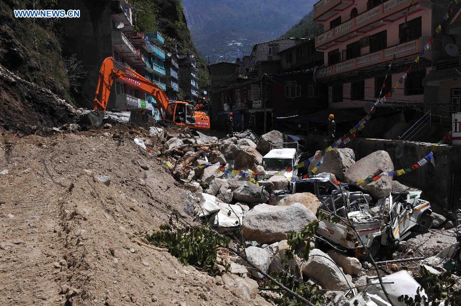 A excavator works at the Nepalese side of the Sino-Nepal Friendship Bridge, on May 4, 2015. A traffic rescue team of China's armed police left southwestern Tibet Autonomous Region and entered Nepal for the first time on Sunday to aid earthquake relief there. (Xinhua/Wen Tao)
