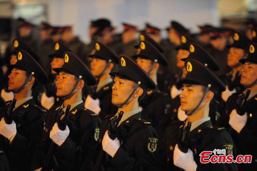 Chinese PLA honor guards march during the night rehearsal for the Victory Day military parade which will take place at Moscow's Red Square on May 9 to celebrate 70 years after the victory in WWII, in Moscow, Russia, May 4, 2015. (Photo: China News Service/Wang Xiujun)