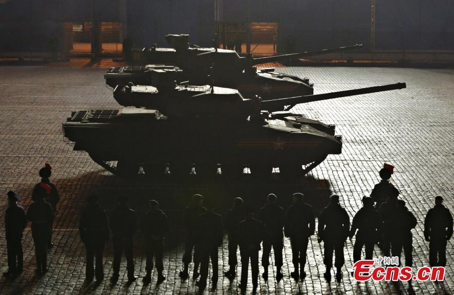 Russian military vehicles including the new Russian T-14 Armata tank make their way to Red Square during a rehearsal for the Victory Day military parade which will take place at Moscow's Red Square on May 9 to celebrate 70 years after the victory in WWII, in Moscow, Russia, May 4, 2015. About 200 pieces of military hardware and 16,500 troops will take part in the parade on Red Square. (Photo provided to China News Service)