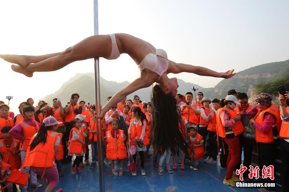 In this photo taken on May 2, 2015, post-90s pole dancer Liu Feifei performs human flag on a cruise of the Yellow River, drawing a large number of tourists. (CNS/Wang Zhongju)