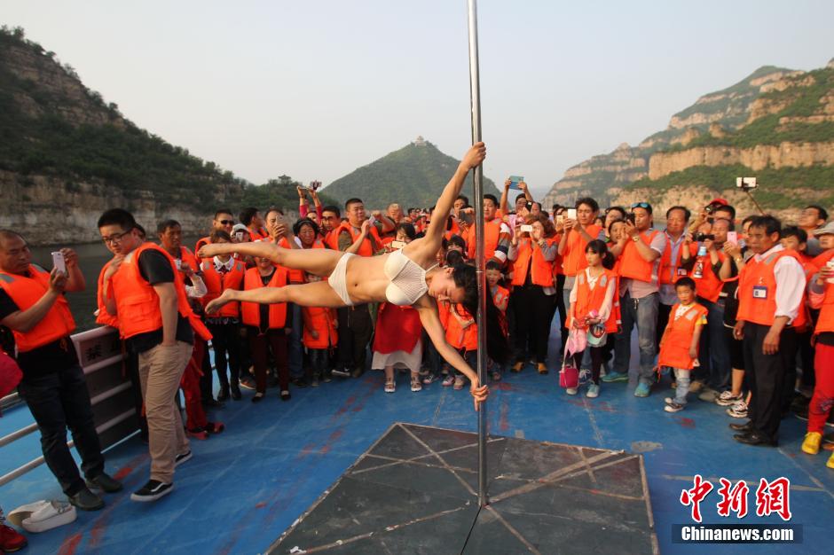 In this photo taken on May 2, 2015, post-90s pole dancer Liu Feifei performs human flag on a cruise of the Yellow River, drawing a large number of tourists. (CNS/Wang Zhongju)