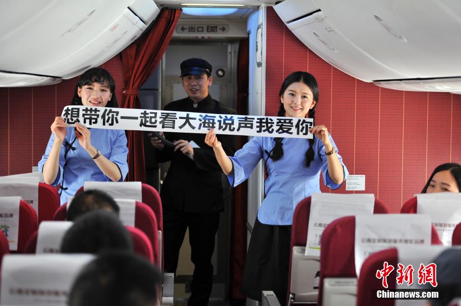 On the fight from Kunming to Sanya, Lucky Air stewardesses dressed in vintage school uniforms celebrate the Youth Day on May 4, 2015. (CNS/ Liu Ranyang)