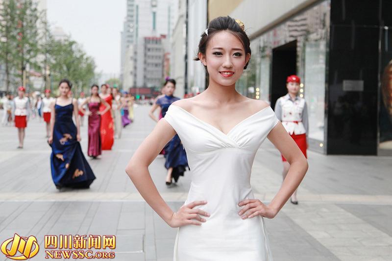 More than 20 future flight attendants stage a flash mob show in Chengdu, capital of southwest China's Sichuan province, May 3, 2015. (Photo/newssc.org)