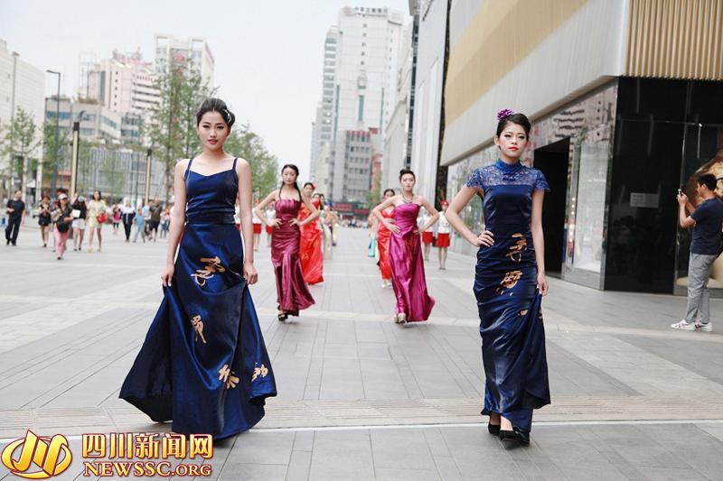 More than 20 future flight attendants stage a flash mob show in Chengdu, capital of southwest China's Sichuan province, May 3, 2015. (Photo/newssc.org)