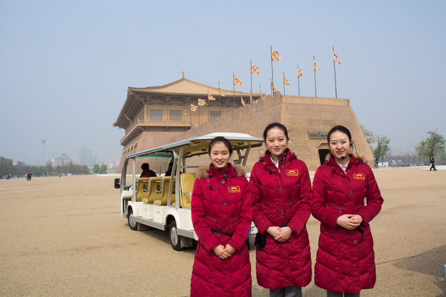 | Three park guides stand at attendance at the Daming Palace gate. Daming Palace was the residence for Tang Dynasty emperors in Chang'an, now Xi'an, Shaanxi Province. Photo taken April 9, 2015. [Photo: CRIENGLISH.com/William Wang] |