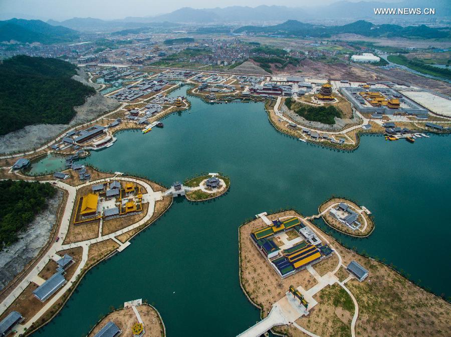 Photo taken on May 5, 2015 shows an aerial view of Fuhai, a man-made lake which is part of the newly-built "Old Summer Palace", also known as "Yuanmingyuan", in the Hengdian World Studios in Dongyang, east China's Zhejiang Province. The first phase of the construction of a new "Old Summer Palace" same sized with the original one in Beijing has been completed. Chunyuan, one of the four major gardens in the Palace occupying most areas, is expected to be open to the public on May 10, 2015. With a total investment of 30 billion yuan (about 4.8 billion U.S. dollars). the rest three gardens will be completed in 2016. (Xinhua/Xu Yu)