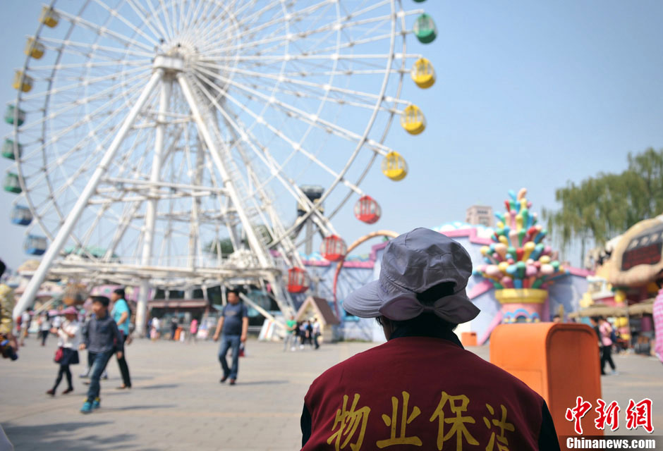 A cleaner sits quietly and looks at the people who want to experience the Ferris wheel. (CNS/Li Peiyun)