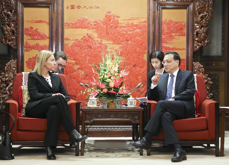 | Chinese Premier Li Keqiang (R, front) meets with Federica Mogherini, European Union (EU) High Representative for Foreign Affairs and Security Policy and Vice President of the European Commission, in Beijing, capital of China, May 6, 2015. (Xinhua/Ding Lin) |