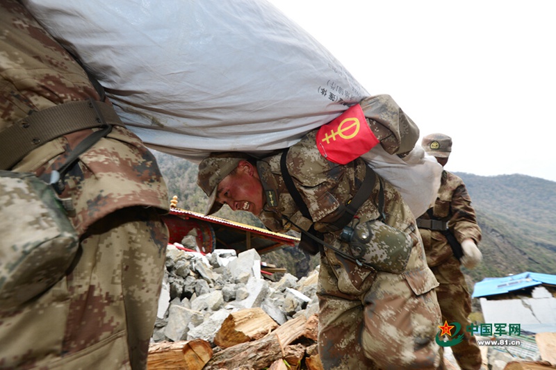 A team of 125 militiamen and 150 frontier guards conduct earthquake relief in Riongxar Town, Tingri County at the foot of Mt. Qomolangma after an 8.1-magnitude quake shook Nepal on April 25, which also affected the southwestern part of Tibet. (Photo/ Zhang Zhen)
