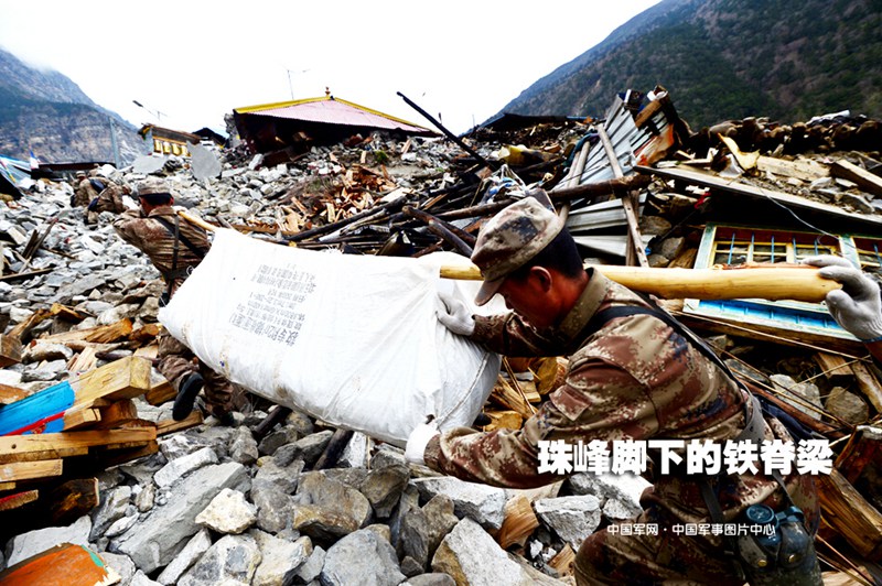A team of 125 militiamen and 150 frontier guards conduct earthquake relief in Riongxar Town, Tingri County at the foot of Mt. Qomolangma after an 8.1-magnitude quake shook Nepal on April 25, which also affected the southwestern part of Tibet. (Photo/ Zhang Zhen)