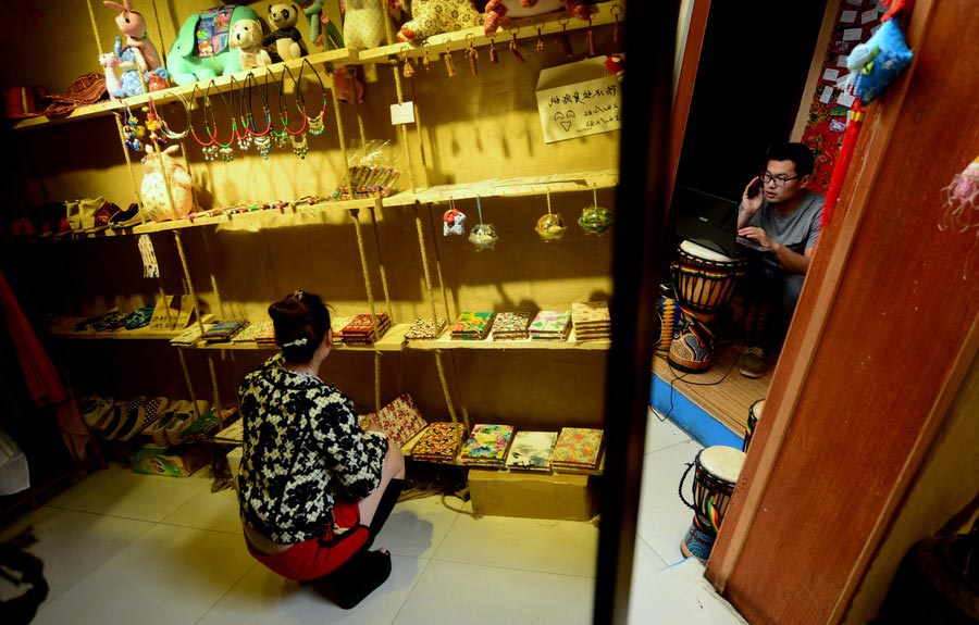 Chen Anjie (R) and his girlfriend pull a bed sheet in his inn in Jinan, capital of east China's Shandong province, May 6, 2015. (Xinhua/Zhao Xiaoming)