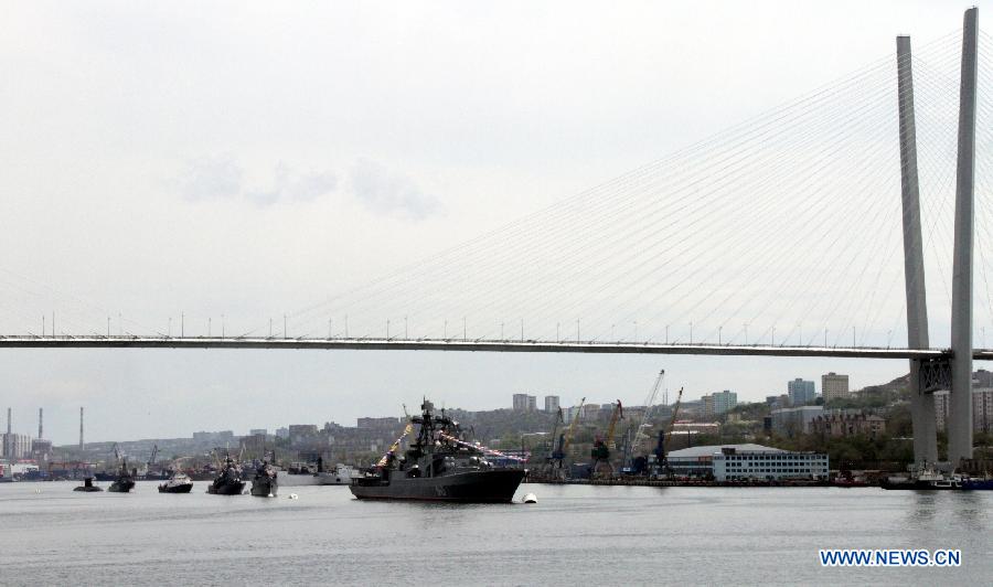 Russian military vessels are seen during the military parade marking the 70th anniversary of the victory in the Great Patriotic War, in Vladivostok, Russia, May 9, 2015. (Xinhua/Valery)