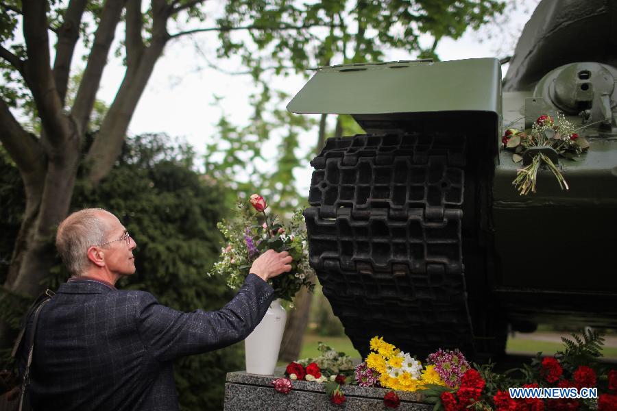 | A visitor presents flowers near a tank model during a memorial ceremony marking the 70th anniversary of the end of World War II at the German-Russian Museum in Berlin, Germany, May 8, 2015. (Xinhua/Zhang Fan) |