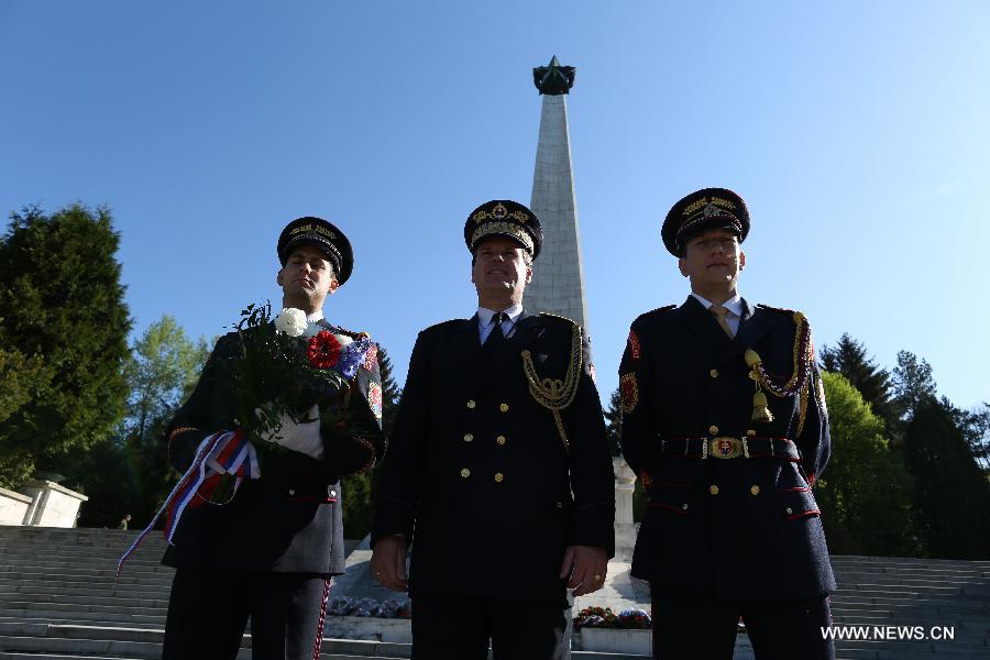 Guard of Honour are seen in front of the War Memorial during a commemoration event of the 70th anniversary of World War II victory in Europe held in the Central Military Cemetery of Royal Romanian Amry and Red Army in Zvolen, central Slovakia, May 8, 2015. (Xinhua/Erik Adamson)