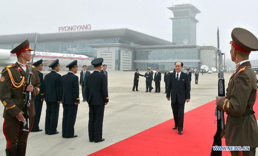 | Photo provided by Korean Central News Agency (KCNA) on May 8, 2015 shows Kim Yong Nam (2nd R), president of the Presidium of the Supreme People's Assembly of the Democratic People's Republic of Korea (DPRK), leaving Pyongyang on Friday to take part in the celebrations of the 70th anniversary of the victory in the Great Patriotic War to be held in Moscow, capital city of Russia. (Xinhua/KCNA) |