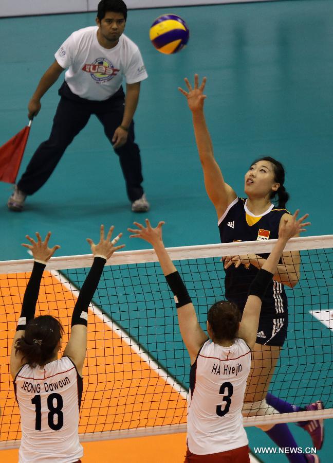| Liu Yanhan (R, top) of China spikes the ball against Jeong Dawoun (L, bottom) and Ha Hyejin of South Korea during a semifinal of the 1st Asian U-23 Women's Volleyball Championship in Pasig City, the Philippines, May 8, 2015. China won 3-0. (Xinhua/Rouelle Umali) |