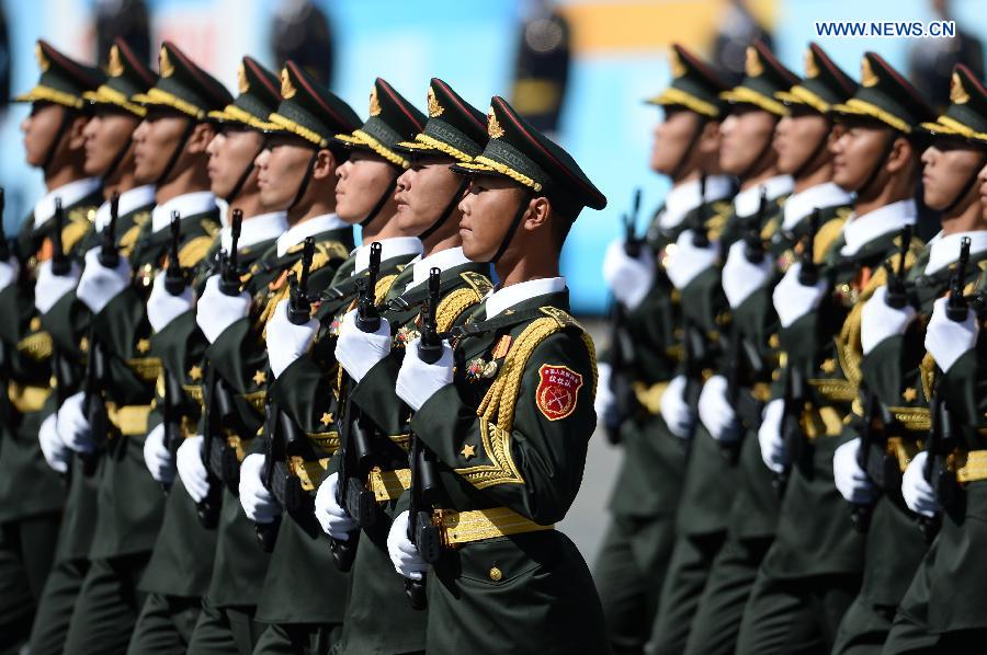 The guard of honor of the three services of the Chinese People's Liberation Army (PLA) take part in the military parade marking the 70th anniversary of the victory in the Great Patriotic War, in Moscow, Russia, May 9, 2015. (Xinhua/Jia Yuchen)