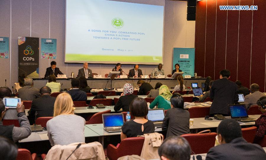 Delegates take part in a side event during the seventh meeting of the conference of the parties to the Stockholm Convention in Geneva, Switzerland, May 8, 2015. UN officials on Friday hailed China's achievement in the effort to reduce, abandon and control the persistent organic pollutants (POPs) in the seventh meeting of the Conference of the Parties to the Stockholm Convention, held here from May 4 to 15. (Xinhua/Xu Jinquan)