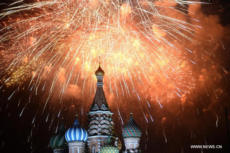 Fireworks are seen near Saint Basil's Cathedral during an event marking the 70th anniversary of Victory Day over Fascism in Moscow, Russia, May 9, 2015. (Xinhua/Pavel Bednyakov)