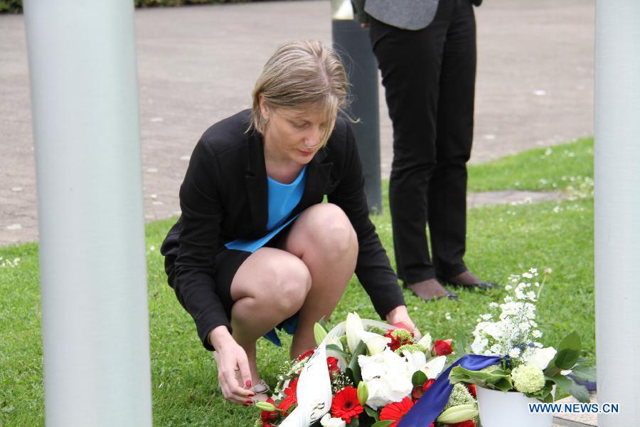 A representative lays bouquet during the commemorative event held by the Council of Europe to mark the 70th anniversary of victory in the World Anti-Fascist War at the headquarters of the Council of Europe in Strasbourg, France, May 9, 2015. (Xinhua/Lu Suyan)